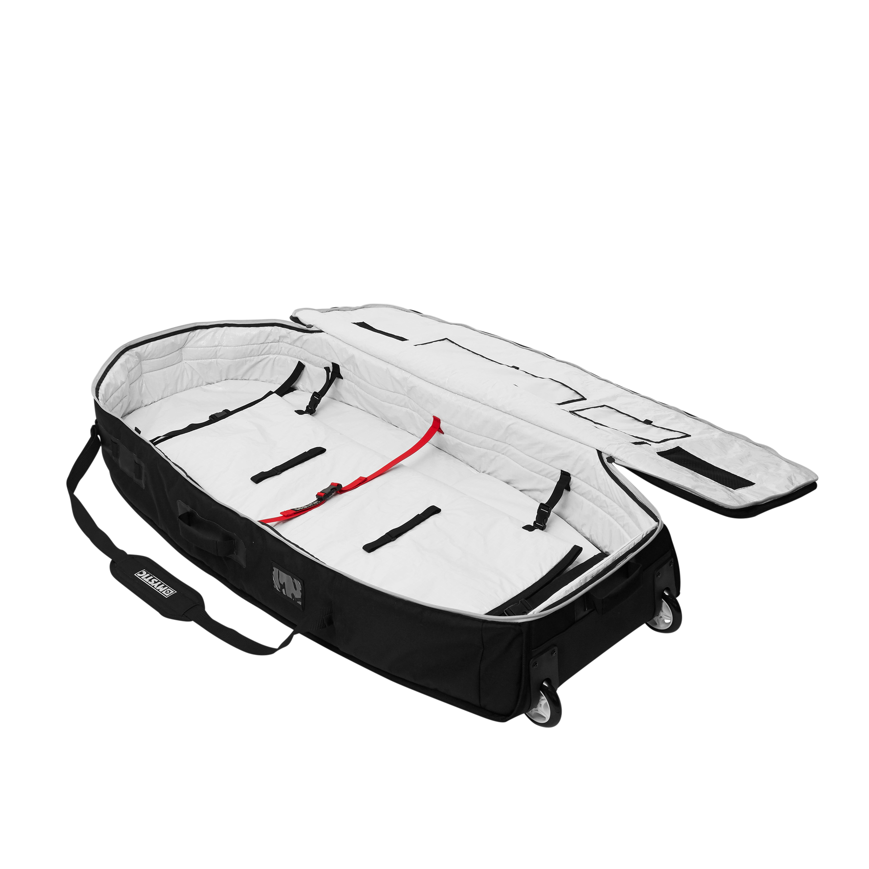 Built with plenty of room, the wheeled Star Wingfoil Boardbag can fit up to 2 boards, 3 wings, 2 foils and a pump. Extra foam protection against the rails make sure your goods stay safe while in transit. The boardbag also features transparent tool pockets and various removable padded gear pockets, to save weight if you need to.