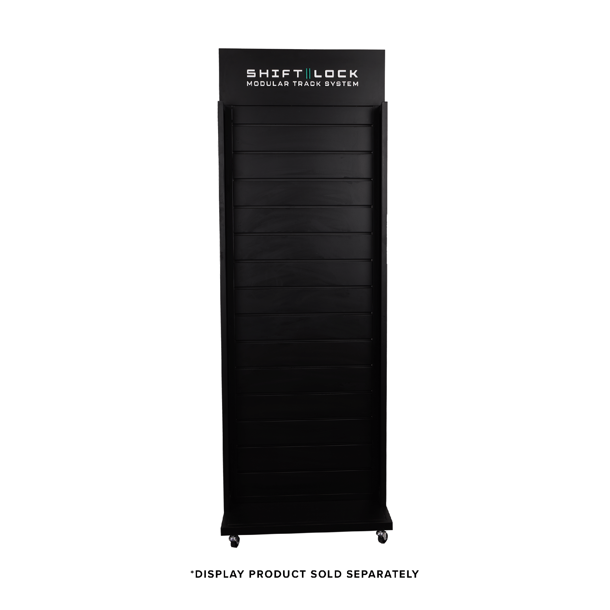 1750H x 600W x 400D (mm) Metal Double-Sided Flatpack Slat Stand, 4x Wheels, 1x Acrylic ShiftLock logo panel, 30x Unbranded Hooks
