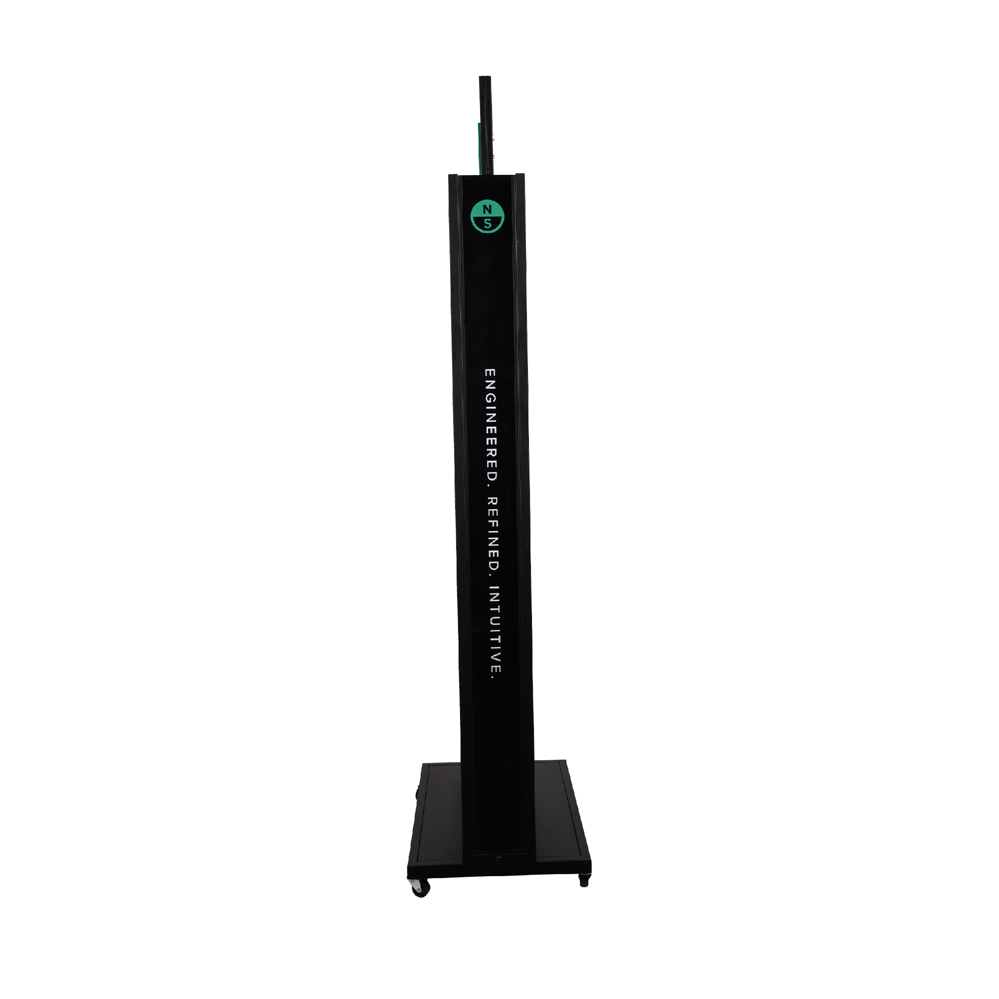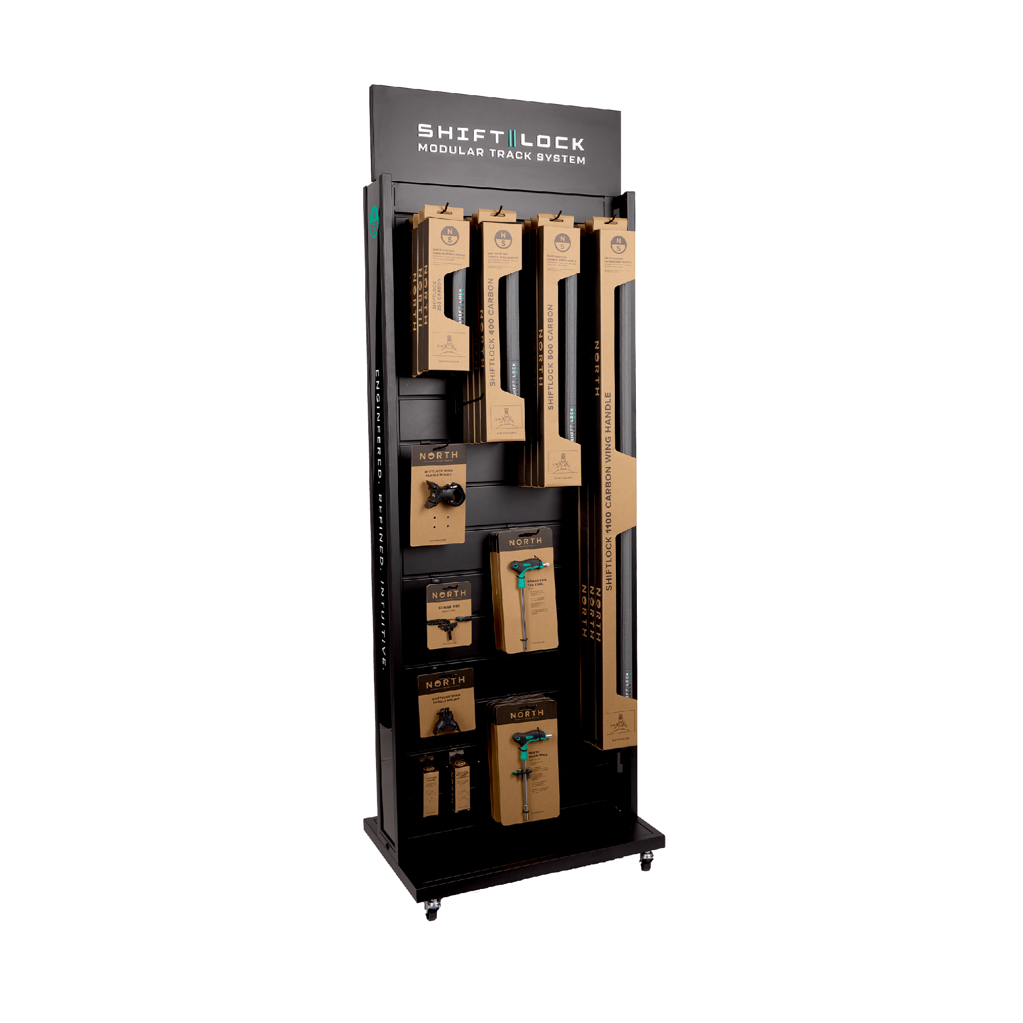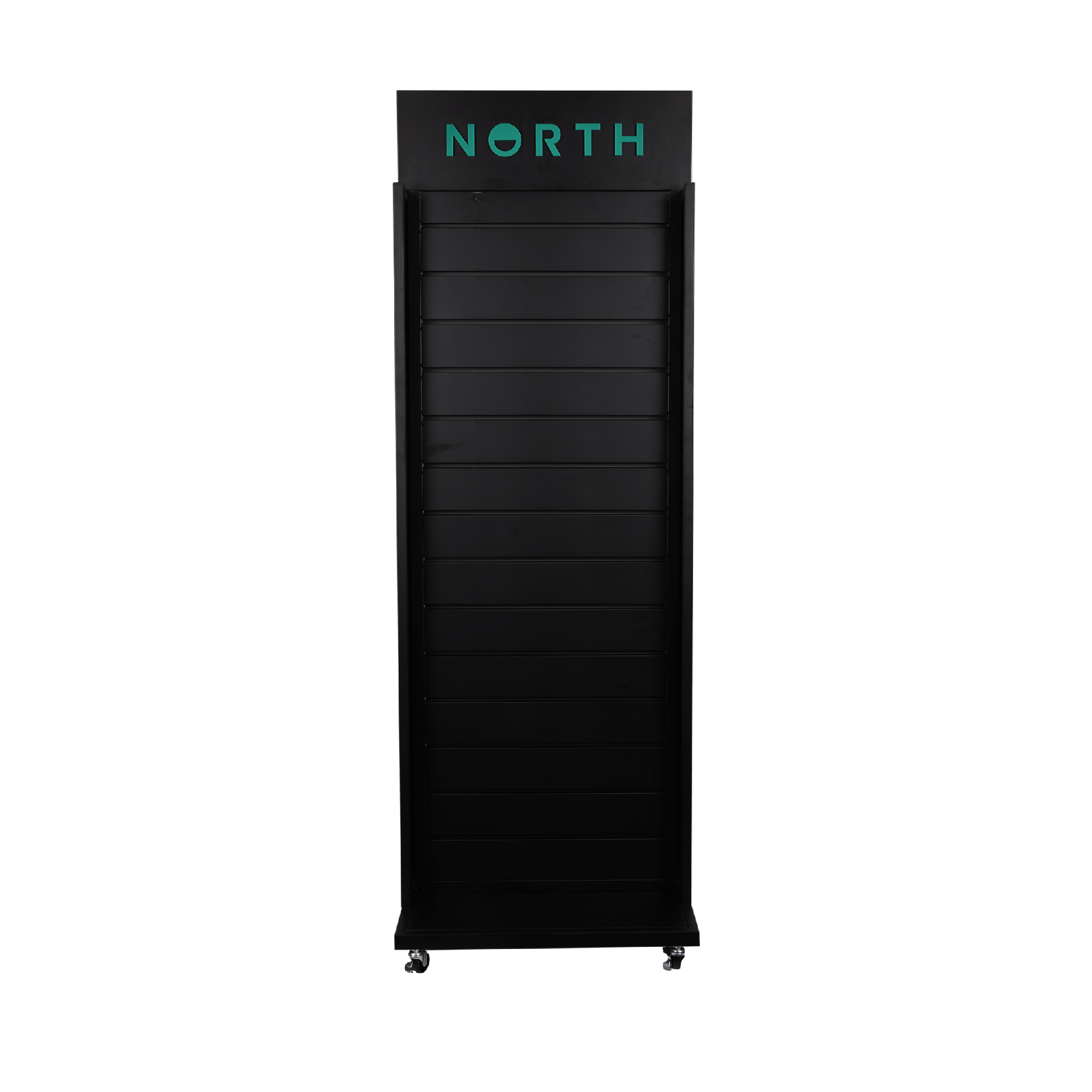 Ideal for displaying the ShiftLock Handles, Accessories and Spare Parts, this double-sided metal slat rack display stand has usable display panels on both sides and a base on wheels that extends on either side. These units can be placed anywhere in the store and can be arranged next to each other to create aisles. Each unit is fitted with horizontal slat panels separated by a series of grooves 100mm apart, into which hooks or shelving brackets can be slotted. NS Logo branded display hooks and retail shelves are available separately. The attachments slide in and out of position, so you can change hangsell displays without using drills or screwdrivers. Warning: To reduce risk of serious or fatal injury, read and follow all instructions. Once assembled, North recommends securing the stand to prevent tipping.
