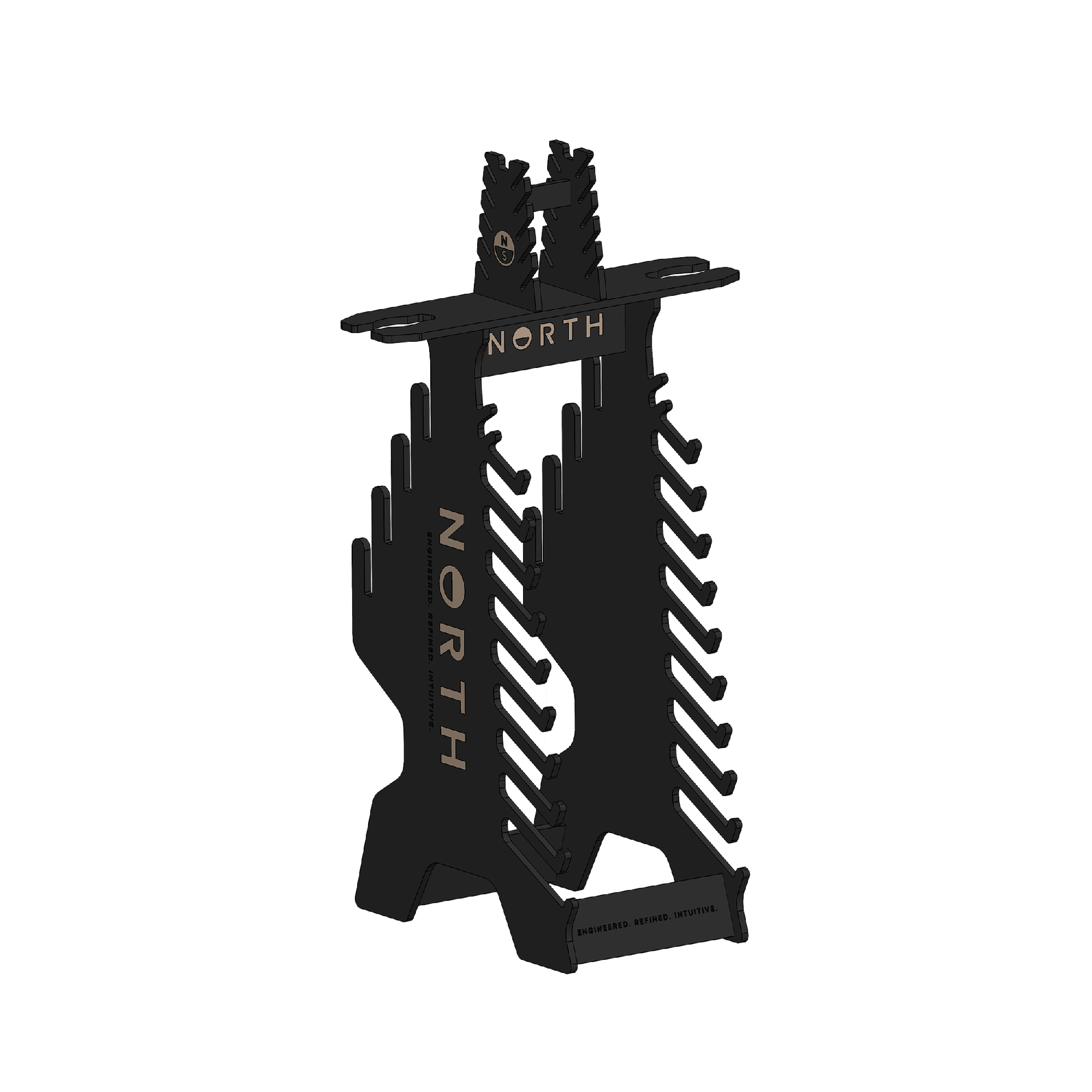 North logo-branded double-sided plywood veneer display unit for the Sonar Foil System. Holds 10x Front Wings, 2x Fuselage, 10x Stabilizers, 2x Mast and 4x assembled Front Wing/Fuse/Stab setups*. Dimensions are 1870h x 1050w x 872d mm. Easy flatpack assembly. *All Sonar Foil parts sold separately.