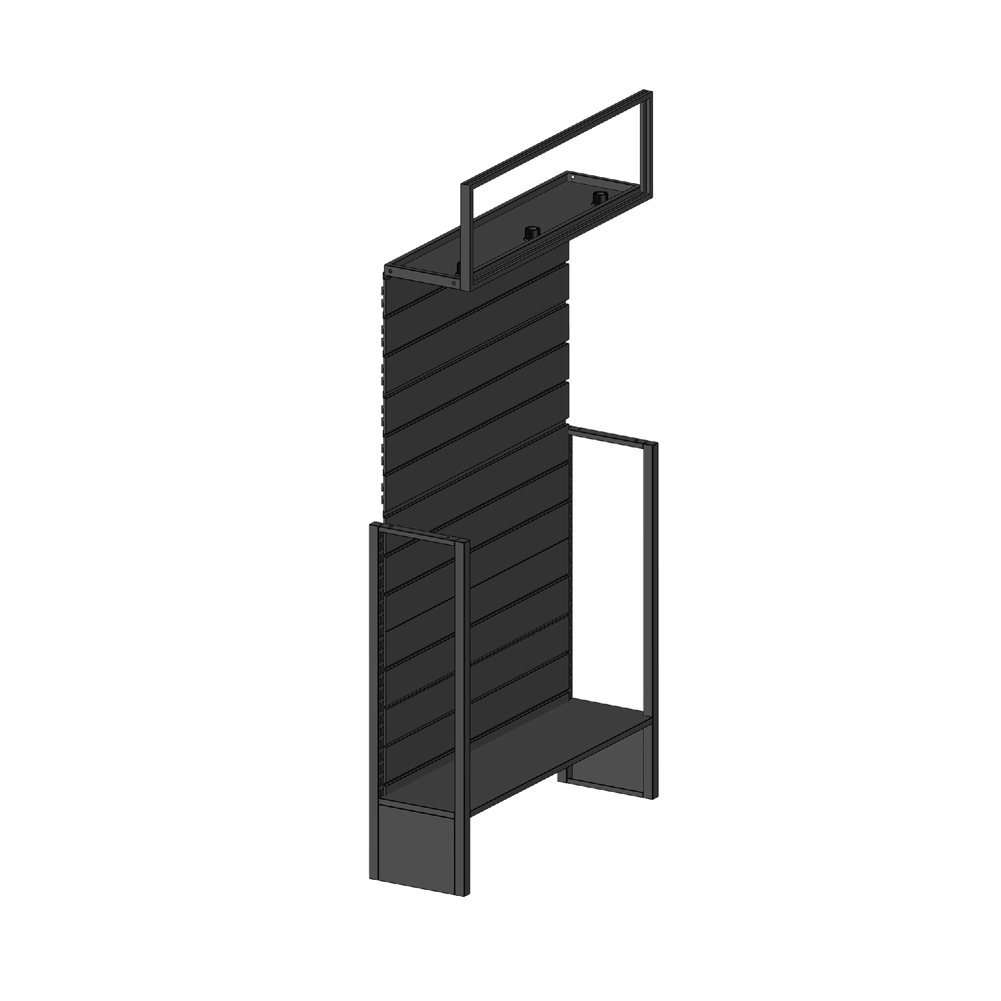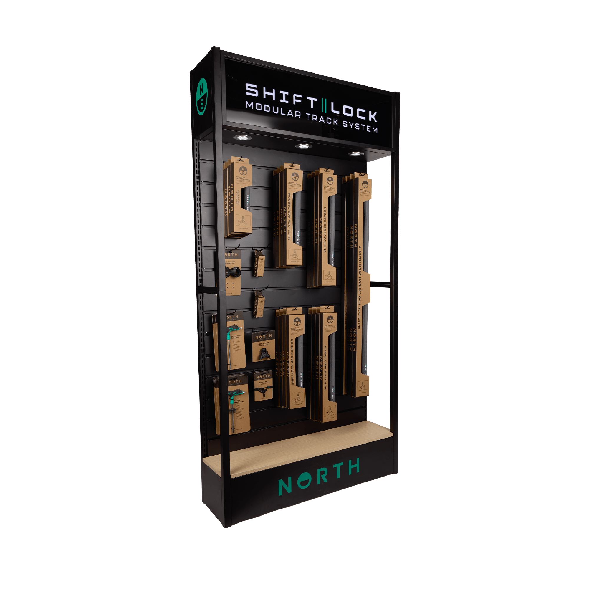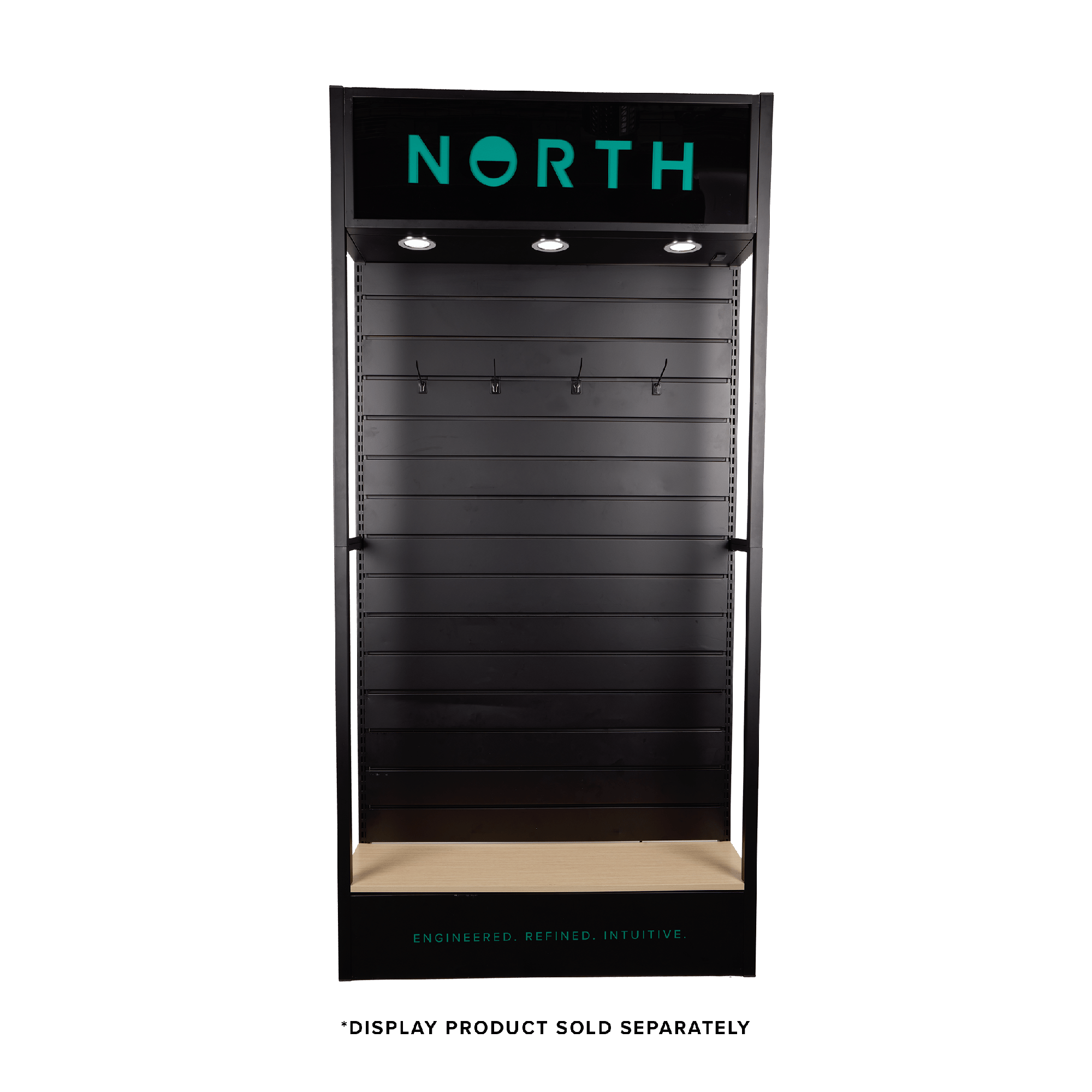 Fasten our single-sided slat rack display stand against a wall or double-up to create a freestanding shop-fitting solution for showcasing North Products, Accessories and Parts in your store*. These units come with a lightbox, downlights, and 50 unbranded hooks. The branding pack for the lightbox at the top is sold separately, giving you a choice between SHIFTLOCK or NORTH logos.** Each unit is fitted with horizontal slat panels separated by a series of grooves 100mm apart, into which hooks or shelving brackets can be slotted. NS Logo branded display hooks and retail shelves are available separately. The attachments slide in and out of position, so you can change hangsell displays without using drills or screwdrivers. Panels are made from coated MDF. *WARNING: We recommend fixing the unit to a solid construction, wall, or floor to prevent tipping. **The Universal Display Stand cannot be assembled without parts contained in the Branding Pack.